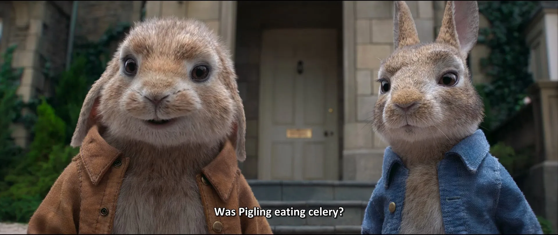 Actors: James Corden as Peter Rabbit (voice), Rose Byrne as Beatrix 'Bea' Potter / Jemima Puddle-Duck (voice), Margot Robbie as Flopsy Rabbit / Narrator (voice), Sam Neill as Mr. McGregor / Tommy Brock (voice), Domhnall Gleeson as Thomas McGregor / Mr. Jeremy Fisher (voice), Daisy Ridley as Cottontail Rabbit (voice), Elizabeth Debicki as Mopsy Rabbit (voice), Sia as Mrs. Tiggy-Winkle (voice), Felix Williamson as Derek, Fayssal Bazzi as Mr. Tod (voice), Ewen Leslie as Pigling Bland (voice), Rachel Ward as Josephine Rabbit (voice), Bryan Brown as Mr. Rabbit (voice), David Wenham as Johnny Town-Mouse (voice), Fletcher Sheridan as Singing Sparrow (voice), Marianne Jean-Baptiste as General Manager, Terenia Edwards as Siobhan, Colin Moody as Benjamin Bunny (voice), Christian Gazal as Felix D'eer (voice), Alexandra Gluck as London Street Rat (voice), Taryn Gluck as London Street Rat (voice), Will Reichelt as JW Rooster II (voice), Jessica Freedman as Singing Sparrow (voice), Shana Halligan as Singing Sparrow (voice), Katharine Hoye as Singing Sparrow (voice), Chris Mann as Singing Sparrow (voice), Chad Reisser as Singing Sparrow (voice), Vauxhall Jermaine as Jackson