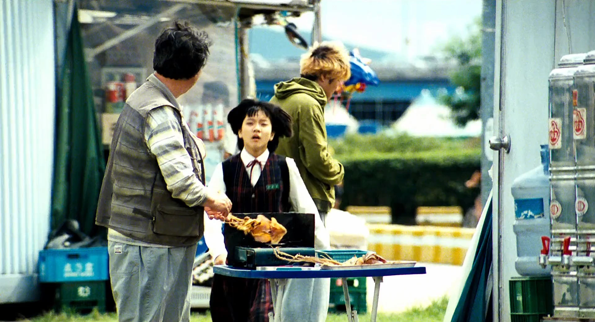 Actors: Song Kang-ho as Park Gang-du, Byun Hee-bong as Park Hie-bong, Park Hae-il as Park Nam-il, Bae Doona as Park Nam-joo, Ko A-sung as Park Hyun-seo, Oh Dal-su as The Monster (voice), Lee Jae-eung as Se-jin, Lee Dong-ho as Se-joo, Yoon Je-moon as Homeless Man, Yim Pil-sung as Fat Guevara, Kim Roi-ha as Yellow Suit at Funeral, Koh Soo-hee as Hostage nurse, Kim Hak-sun as Civilian Military Kim, Scott Wilson as Douglas, Brian Rhee as Young Korean Doctor, Paul Lazar as American Doctor, David Anselmo as Donald, Baek Do-bin as Fumigation Truck Skinny Man, Martin Lord Cayce as U.S. Senator (uncredited), Choi Dae-sung as Man from Duck Boat (uncredited), Choi Doo-yeong as Man on Blind Date (uncredited), Choi Jae-sup as Detective Agency Subordinate 1 (uncredited), Jung Seo-yoon as Woman with Long Hair (uncredited), Philip Hersh as Additional Voices (voice) (uncredited), Jeong In-gi as Isolation Ward Doctor (uncredited), Jeong Hyeong-Ho as 4th Mat 3 (uncredited), Ji Ha-geon as Camera Phone Man (uncredited), Jung Kang-hee as Mr. Yoon's Employee (uncredited), Kim Bi-bi as Isolation Ward Nurse 1 (uncredited), Kim Choo-wol as Woman crying (uncredited), Kim Da-yeon as 5th Mat Woman (uncredited), Kim Hyo-sun as Quarantine Hospital Nurse 2 (uncredited), Kim Jin-seon as Woman from Couple (uncredited), Kim Nan-hee as Woman from Duck Boat (uncredited), Kim Sang-jo as Old Security Guard (uncredited), Kwon Bang-hyeon as Bride-to-be (uncredited), Kwon Byung-gil as Doctor from Isolation Ward 1 (uncredited), Kwon Hyeok-Pung as Fisherman 1 (uncredited), Lee Dong-yong as 4th Mat 2 (uncredited), Lee Eung-jae as Man from Couple (uncredited), Lee Hoon-jin as Fat Man (uncredited), Lee Jong-yoon as 4th Mat 1 (uncredited), Lee Seung-jin as Girl's Father (uncredited), Min Kyung-jin as Altar Security (uncredited), Moon Hee-ra as Camera Phone Woman (uncredited), Clinton Morgan as Agent Yellow (uncredited), Park Jeong-gi as Fumigation Truck Dyed-hir Man (uncredited), Park Kyeong-mok as Groom-to-be (uncredited), Park No-shik as Inquiry Officer, Ra Mi-ran as Woman Stomping Her Feet (uncredited), Seo Ha-neul as Exchanged Girl (uncredited), Shin Seung-ri as Donald's Girlfriend (uncredited), Shin Hyun-jong as Mr. Yoon's Friend (uncredited), Son Young-soon as Grandmother from Bus (uncredited), Son Jin-ho as Doctor from Isolation Ward 2, Song Kyeong-ha as Woman on Blind Date (uncredited), Yoo Seung-mok as Taxi Driver, Yoo Yeon-soo as District officer Mr. Jo (uncredited), Seo Young-ju as Protester, Ko Chang-seok as Nurse, Park Jin-woo as Isolation Ward Constable (uncredited)